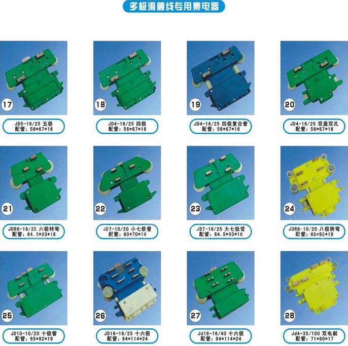 大三極、雙電刷、普通轉彎、轉彎、大頭雙電刷、高低腳轉彎、高低腳、多極集電器、多極滑觸線集電器普通型四極、高低腳四極、普通型、普四極、小雙電刷、五極、四極、雙蓋雙孔、六極轉彎、小七極管、大七極管、八極轉彎、十極管、十六極、防塵雙電刷、大四極、四線插座多極滑觸線集電器。