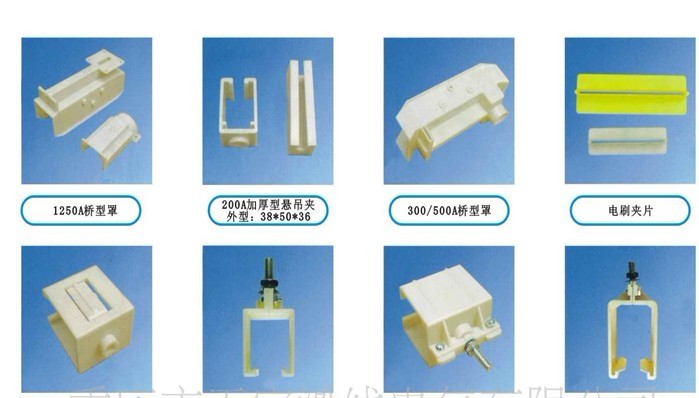 單極滑觸線配件:1250A橋型罩、200A加厚型懸吊架、300500A橋型罩、電刷夾片、500A懸吊架、500A分體式懸吊架、大8字懸吊架、1600A分體式懸吊架、H型滑觸線200A-800A連接頭、500A分體、500A200A檢修段、接頭護盒400A、單極集電器撥車、500A接頭護盒、銅滑線連接架、銅滑線懸吊架。單極滑觸線配件